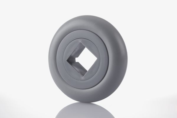 Optisch ansprechendes Abweisrad aus einem harten Innenkern und einer extra weichen Umspritzung als Dämpfung. Der Innendurchmesser dreht sich zusätzlich noch einmal um sich selbst (frei drehend). Auf Anfrage ist auch der Innenkern farblich absetzbar. Sehr gute Dämpfungseigenschaften.
