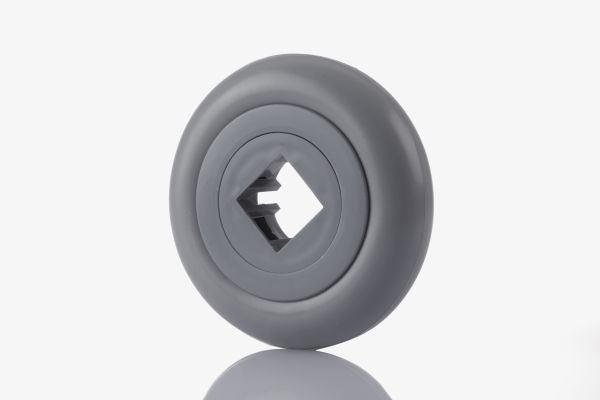 Optisch ansprechendes Abweisrad aus einem harten Innenkern und einer extra weichen Umspritzung als Dämpfung. Der Innendurchmesser dreht sich zusätzlich noch einmal um sich selbst (frei drehend). Auf Anfrage ist auch der Innenkern farblich absetzbar. Sehr gute Dämpfungseigenschaften.