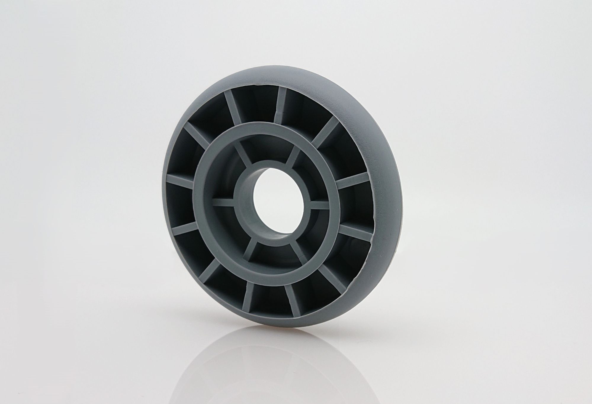 Massives Abweisrad. Auch für schwerere Anwendungen und Belastungen geeignet dank zusätzlicher Verrippung. Geeignet für Rundrohr.