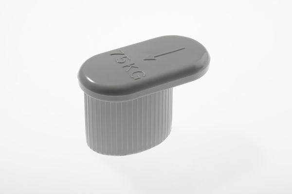 Stopfen für den optisch ansprechenden Abschluss bzw. Verschluss der Aufrichter an Klinik- und Pflegebetten, mit Markierung gemäß Norm "max. 75kg. Belastung".